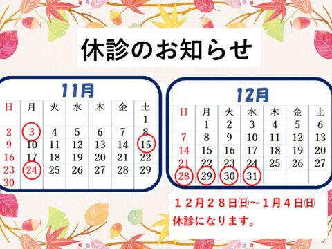 【2025年11月】11月15日土曜日【年末年始】2025年12月28日(日)から2026年1月4日(日)まで休診とさせていただきます。ご理解のほどよろしくお願いいたします。