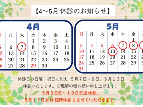 休診日の日曜・祝日に加え3月25日水曜日4月7日火曜日5月7日木曜日~9日土曜日を休診とさせていただきます。ご理解いただけますと幸いです。