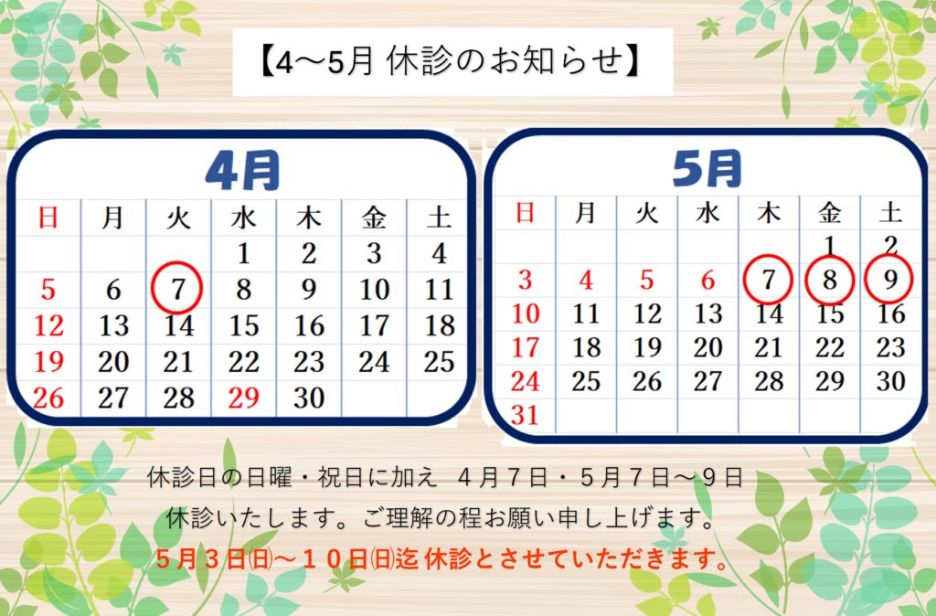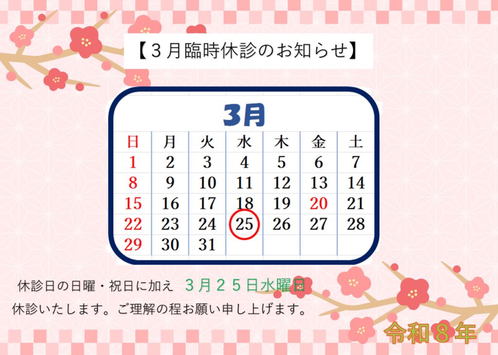 Posted in お知らせ, 院長ブログ 【休診のお知らせ2026年3月~5月】2026.2.14. Posted by Yamasaki Naika CL. Posted on 2月 14, 2026 休診日の日曜・祝日に加え3月25日水曜日4月7日火曜日5月7日木曜日~9日土曜日を休診とさせていただきます。ご理解いただけますと幸いです。 Author: Yamasaki Naika CL.
