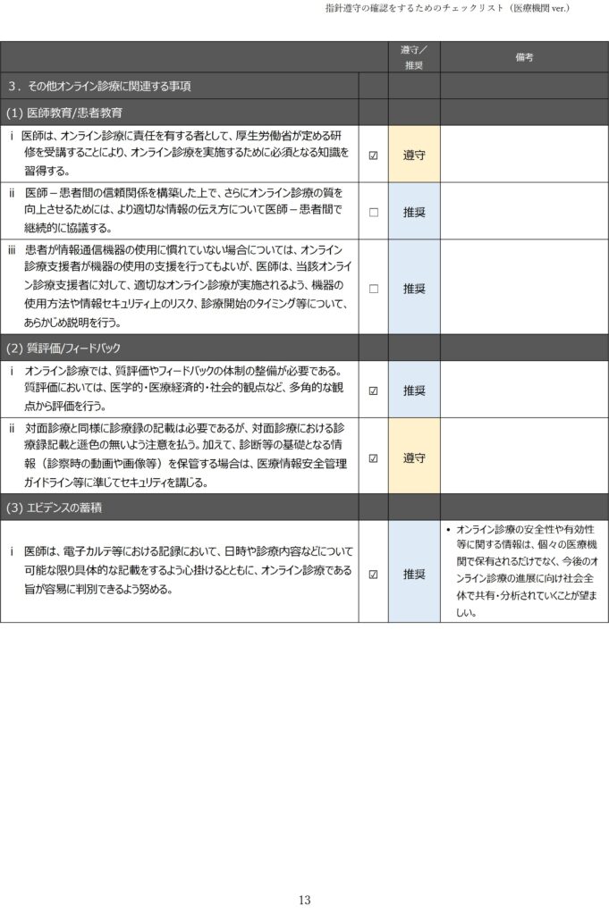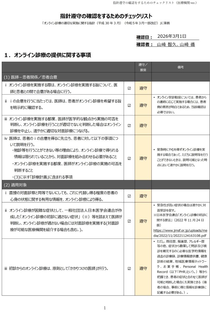 Posted in お知らせ, オンライン診療, 院長ブログ 〇オンライン診療指針遵守の確認をするためのチェックリスト〇2026.3.1. Posted by Yamasaki Naika CL. Posted on 3月 18, 2026 Author: Yamasaki Naika CL.
