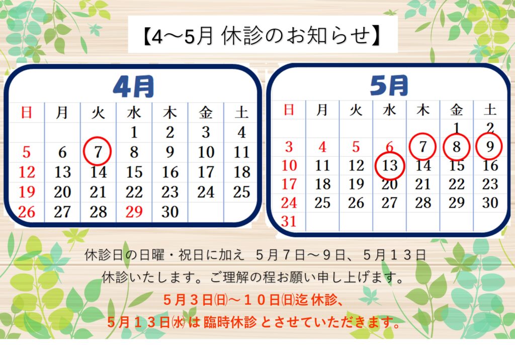 Posted in お知らせ, 院長ブログ 2026年4月~5月の休診について 2026.3.27. Posted by Yamasaki Naika CL. Posted on 3月 27, 2026 休診日の日曜・祝日に加え、4月7日火曜日5月7日木曜日~9日土曜日、5月13日水曜日を休診いたします。ご理解のほどよろしくお願いいたします。 Author: Yamasaki Naika CL.